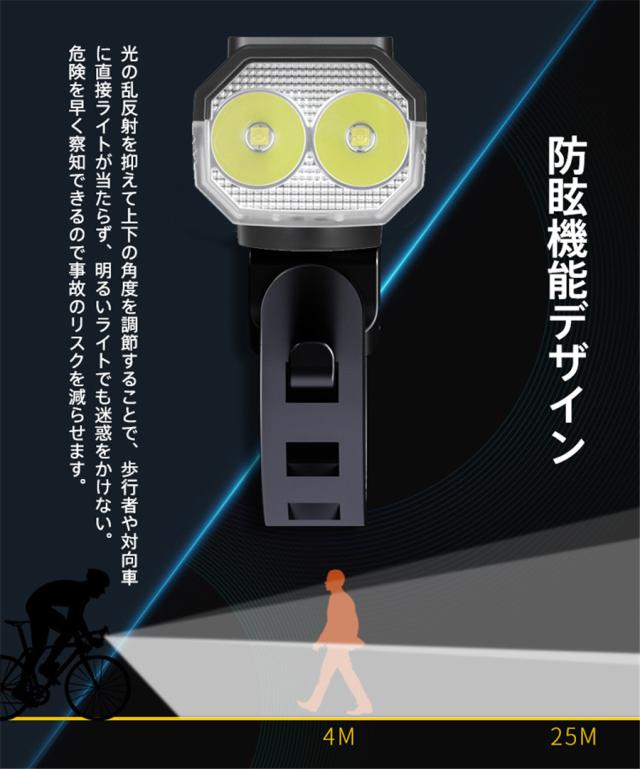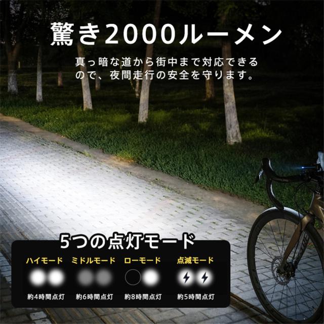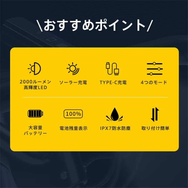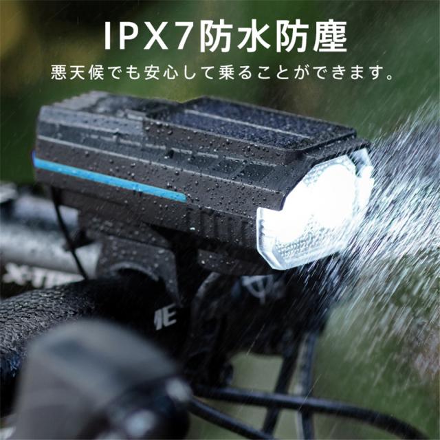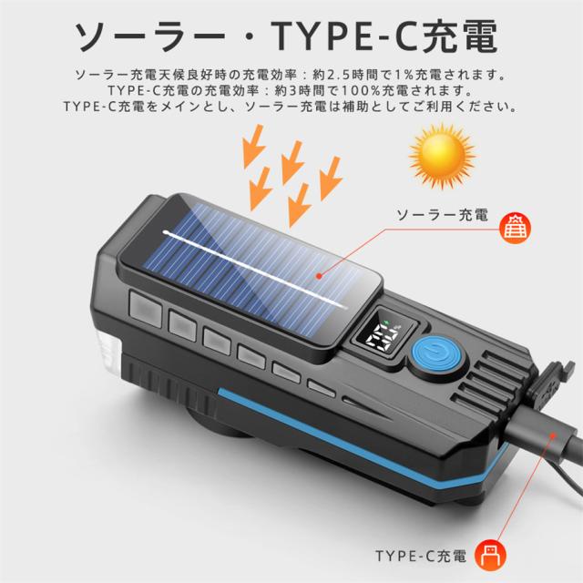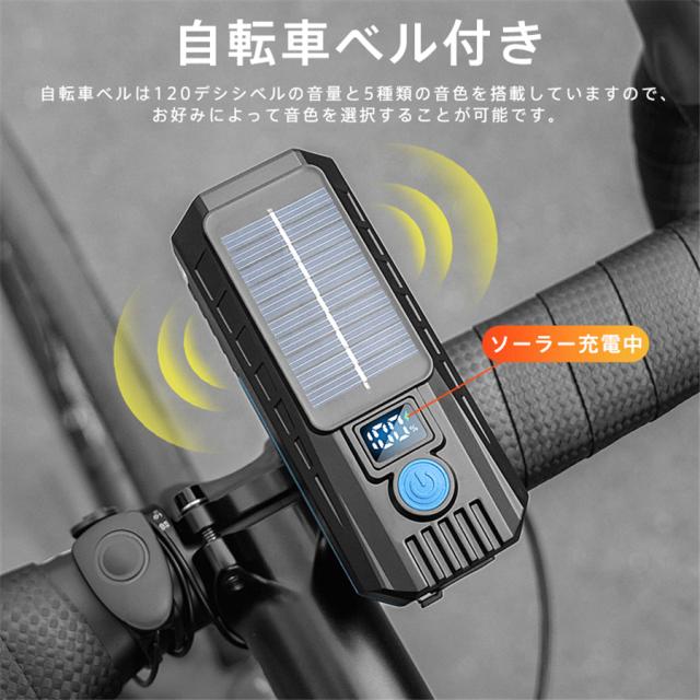 自転車ライト 2000ルーメン ベル付き 高輝度 小型 ソーラー充電 LED USB充電 IPX7防水 電池残量表示 防眩 明るい