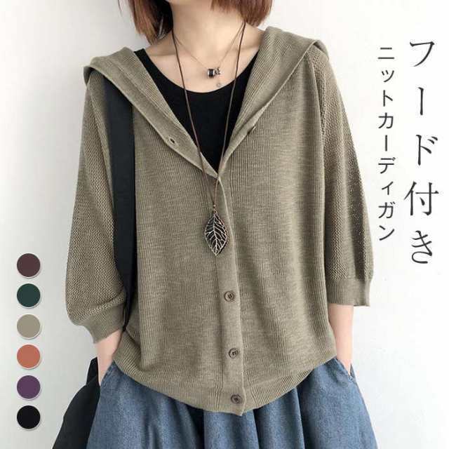 カーディガン レディース トップス パーカー ニットパーカー フード付き ニット ドルマン 春 夏 秋 7分袖 9分袖 無地 Vネック 羽織 セーター 前開き ミディ丈 カジュアル 大きいサイズ 大人 着?せ 冷房対策 UV対策