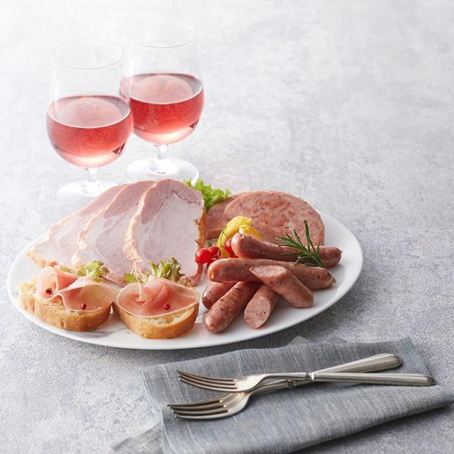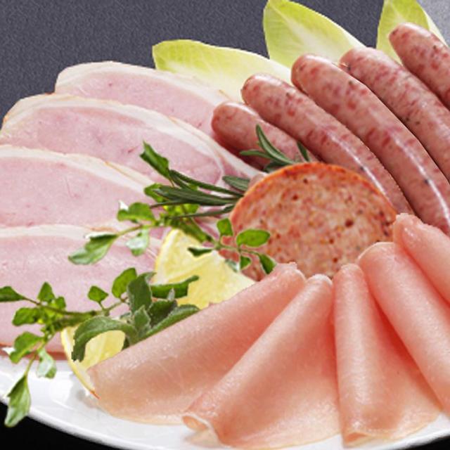 燻ロースハム300g、燻しモモハム300g、スモーク生ベーコン(スライス)60g、炭火焼焼豚200g、荒挽きウインナー100g×2、生ハムロース(スライス)40g、ガーデンブルスト200g