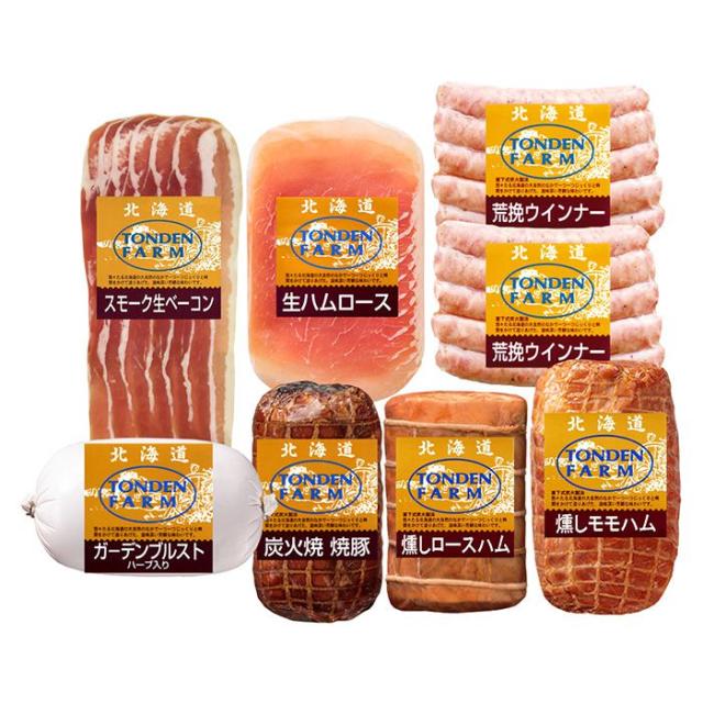 トンデンファーム バラエティセット 燻ロースハム300g、燻しモモハム300g、スモーク生ベーコン(スライス)60g、炭火焼焼豚200g、荒挽きウインナー100g×2、生ハムロース(スライス)40g、ガーデンブルスト200g 【送料無料】