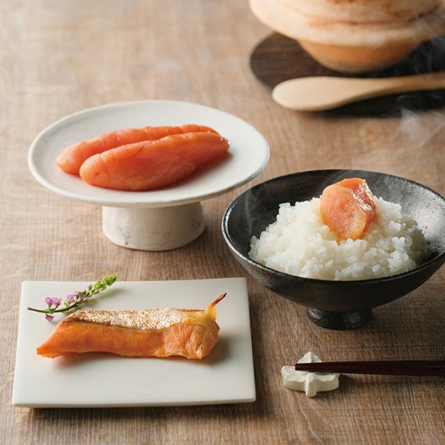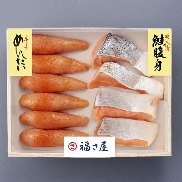 チリ産トラウトサーモンの脂乗りの良い腹身を明太調味液に漬け込んだ「鮭腹身めんたい漬」と、福さ屋自慢の「無着色辛子めんたいのセット」です。