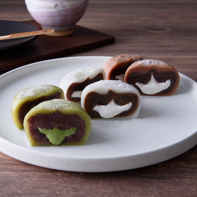 加熱方法にこだわり、香り高く仕上げたコーヒー餡を使ったカフェオレ大福、福岡の八女茶をもち生地、クリームに使用した抹茶クリーム大福、オランダのデザーン社の香り高いココアを使用したショコラクリーム大福をセットしました。ホイップクリームはあえて柔らかく仕上げており、口の中でとろけます。