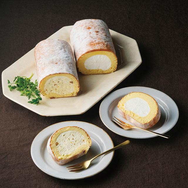 ラム酒をほんのり効かせた、甘さ控えめなクリームをたっぷり巻いたスーパースターロール。口どけの良いクリームがきめ細かな生地によく合います。渋皮栗の粒入りクリームを巻いたマロンスターロールとセットでお届けします。