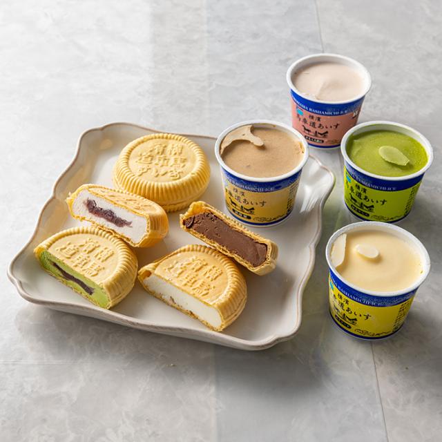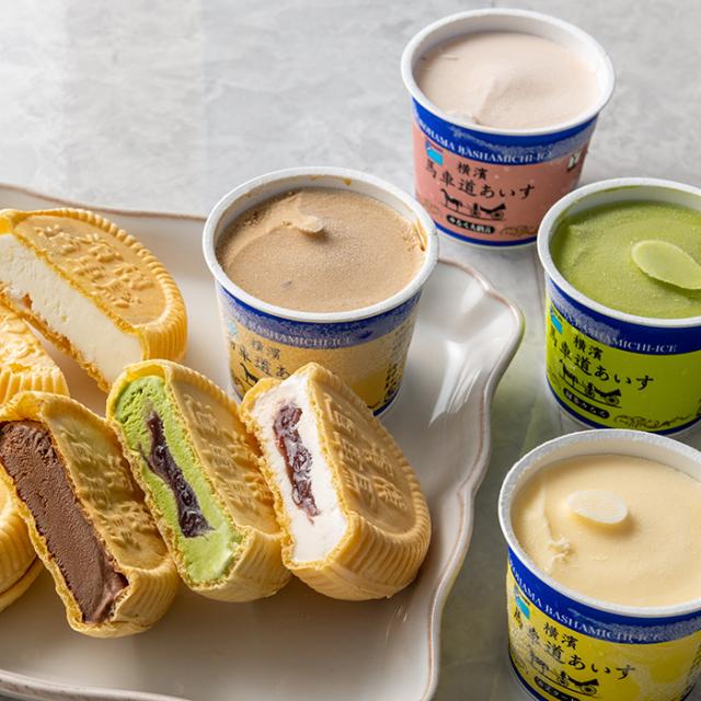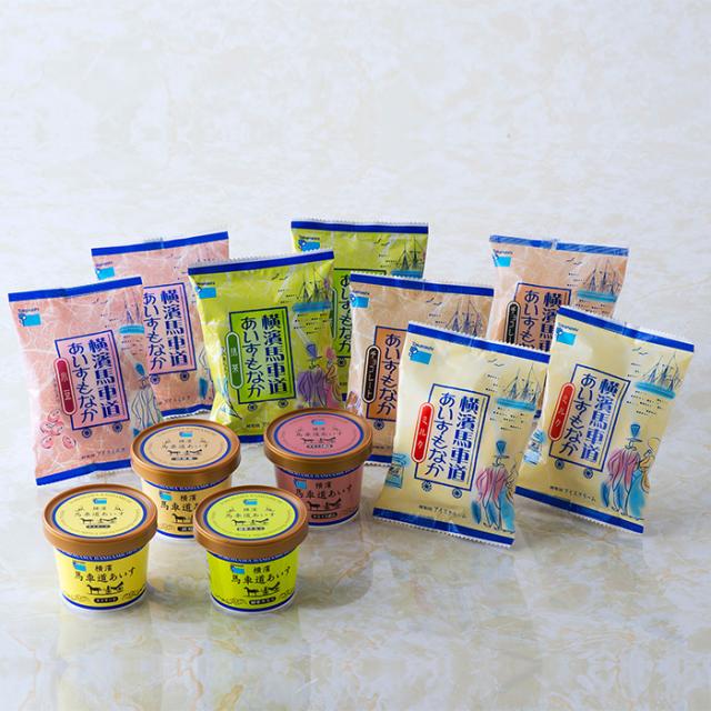 横濱馬車道あいすもなか65ml(ミルク・抹茶・小豆・チョコレート×各2個)、横濱馬車道あいす110ml(カスタード・渋皮栗・みるく大納言・緑茶みるく×各1個)