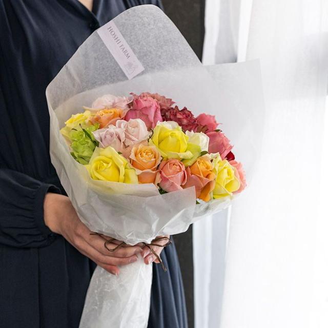 バラ栽培のプロフェッショナルが惜しみない愛情を注ぎ、強く美しいバラへと育てるホシファームのバラ。贈られた花との時間をできるだけ長く楽しんでいただけるよう、花の状態を見極め収穫しています。手元に届いてからふっくらと咲きはじめ、花咲く過程と咲き誇る姿をお楽しみいただけるように、農園から最適なタイミングで直送します。花のある暮らしをお過ごしいただきたい、ご自宅用におすすめのブーケです。
