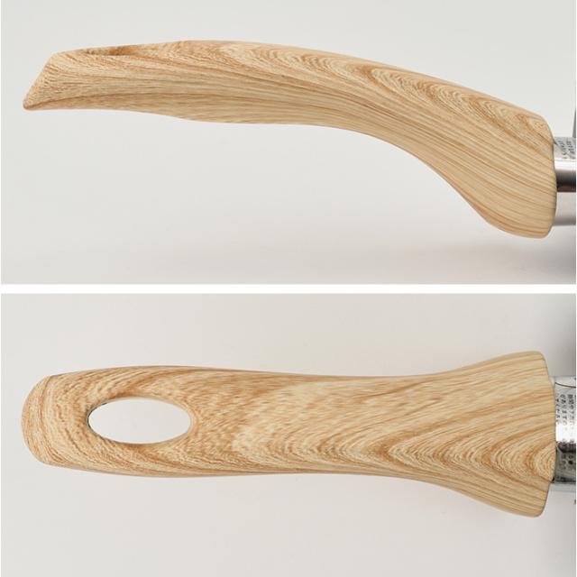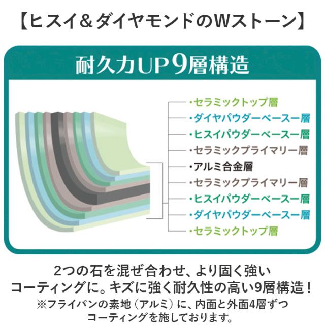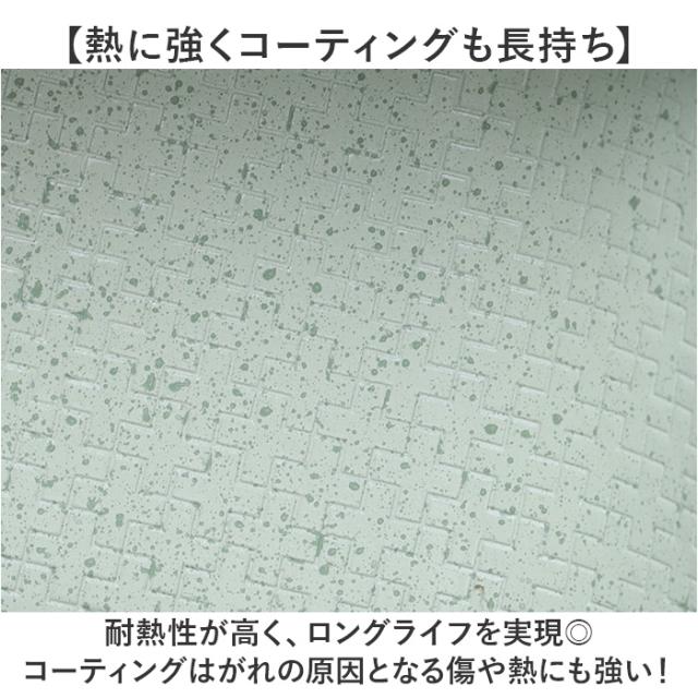 | 素材 | 【表面加工】 [内面]セラミック塗膜加工(翡翠石・ダイヤモンド粉末含有) [外面]セラミック塗膜加工(翡翠石・ダイヤモンド粉末含有) 【材料の種類】 [本体]アルミニウム合金 [底部]ステンレス鋼 [取っ手]フェノール樹脂 |