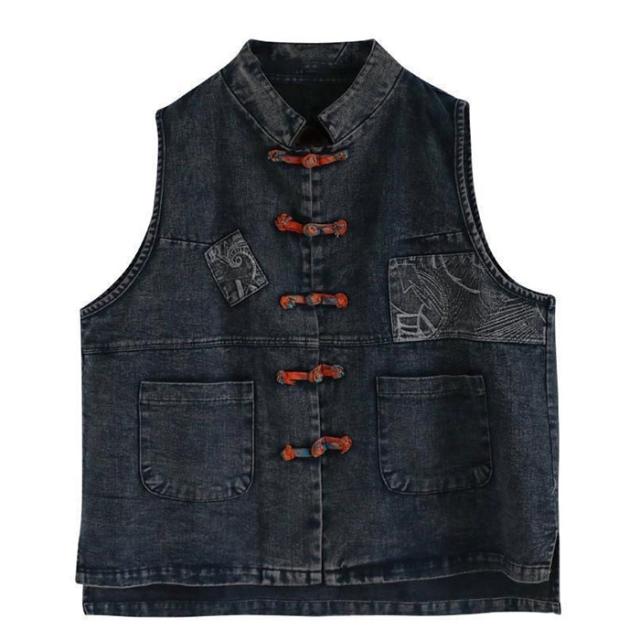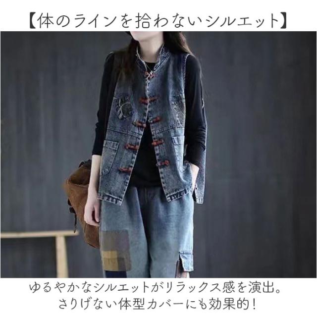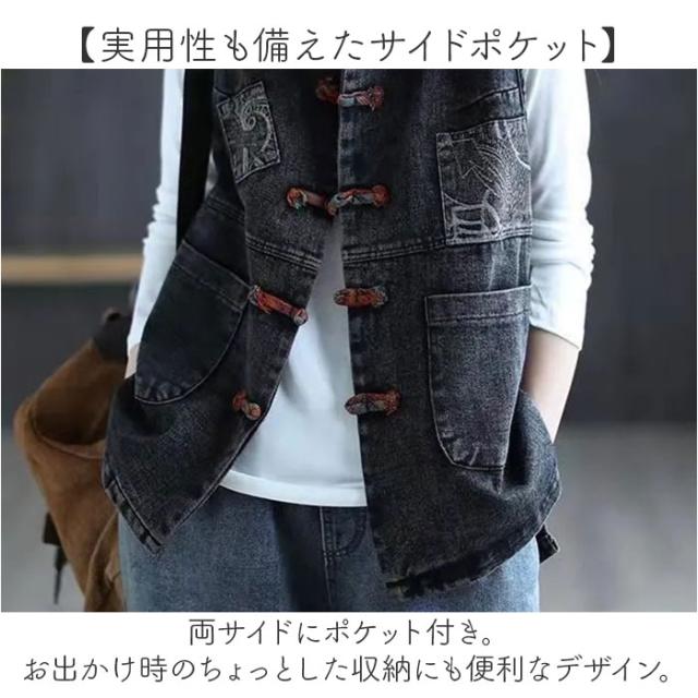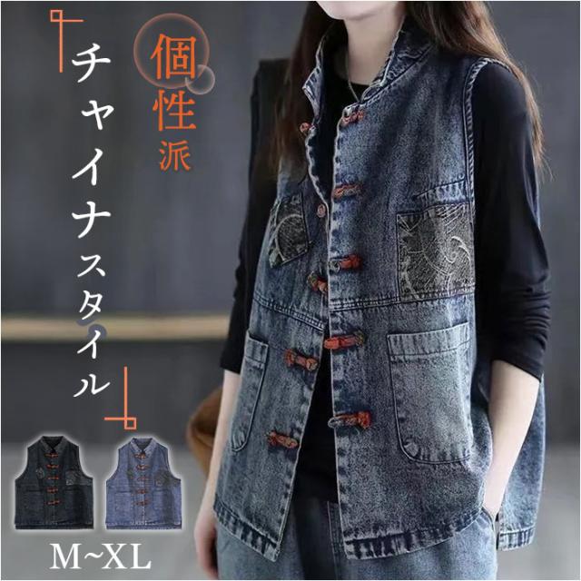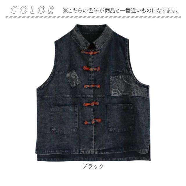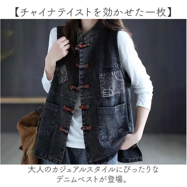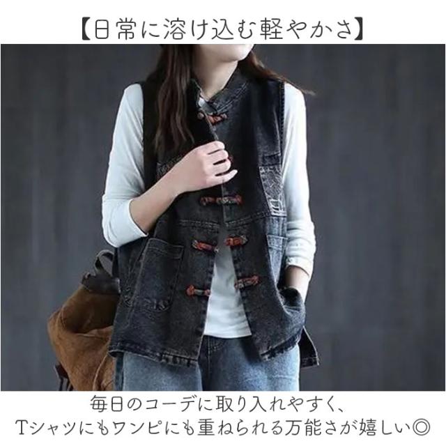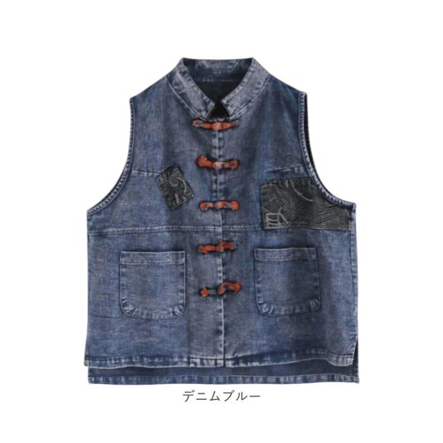 デニムベスト レディース 通販 チャイナ風 トップス デニム ベスト アウター 羽織りもの デニム生地トップス 重ね着 レイヤード 前開きベスト おしゃれ オシャレ ノースリーブ チョッキ チャイナボタン 春秋冬 かわいい 可愛い レディースファッション