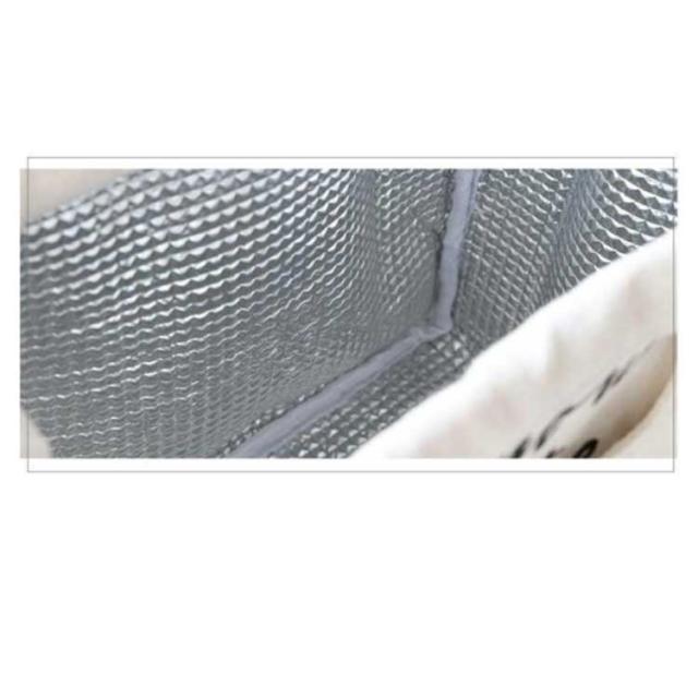 | おしゃれでかわいい、保冷・保温仕様のランチバッグです。 たっぷりの底マチで、どんぶり型のお弁当もすっぽり。 コンパクトなスクエア型フォルムとたっぷりのマチ幅で、ランチボックスは平置きに、500mlペットボトルは横向きにすっぽりと収納可能。 バッグの生地内側は、保温・保冷性に優れたアルミ蒸着シート仕上げ。はっ水性にも優れているので、汚れや水滴がサッと拭き取れてお手入れ簡単。 開け口はスナップボタン開閉で、大きく開いてお弁当の出し入れも楽に出来ます。 通勤・通学やお出掛け時の服装にも優しくマッチする、淡いくすみカラーのバリエーション。 使わない時には小さく折りたたんで、コンパクトに収納可能。お仕事帰りに生鮮食品やスウィーツをちょこっと買いしたときに、カバンからパッと取り出せてとっても便利。 | |