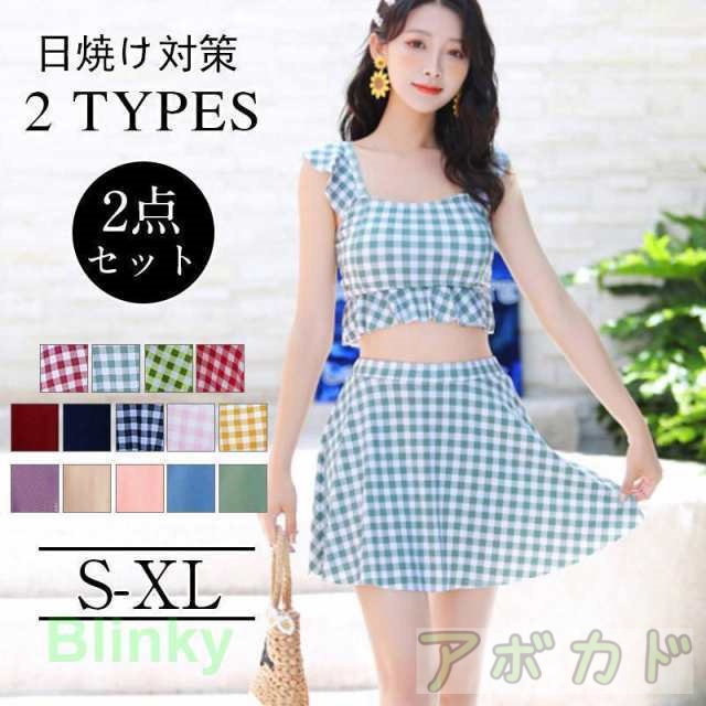 ママ体型に優しい ハイウエストビキニ 2点セット レディース ストライプ柄 ギンガムチェック フレアフリル かわいい水着 ボディカバー
