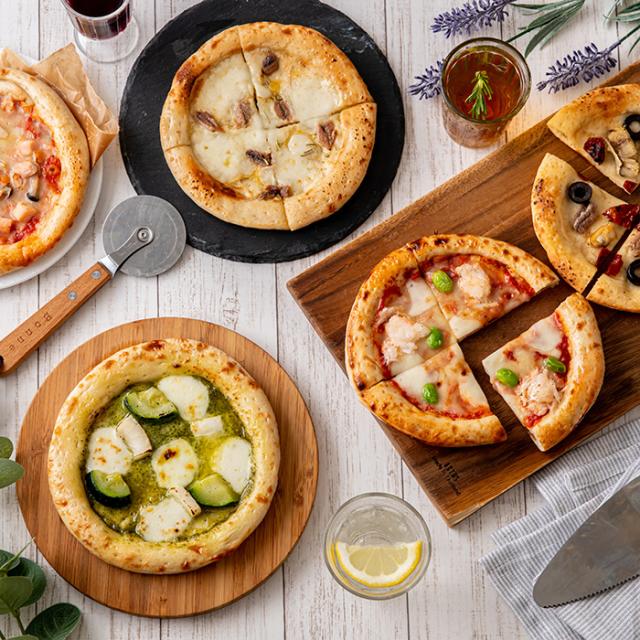 スモークチキンとローストきのこのトマトピザ・まるずわいがにとだだ茶豆のトマトピザ・アンチョビとローストガーリックのピザ・魚介たっぷりのマリナーラピザ・ローストいかのジェノベーゼピザ×各1枚(直径約15cm)