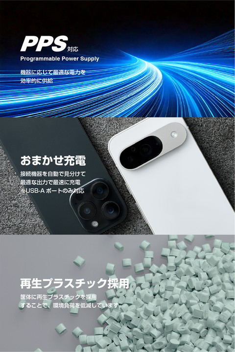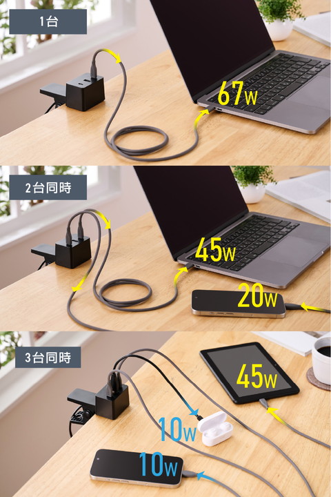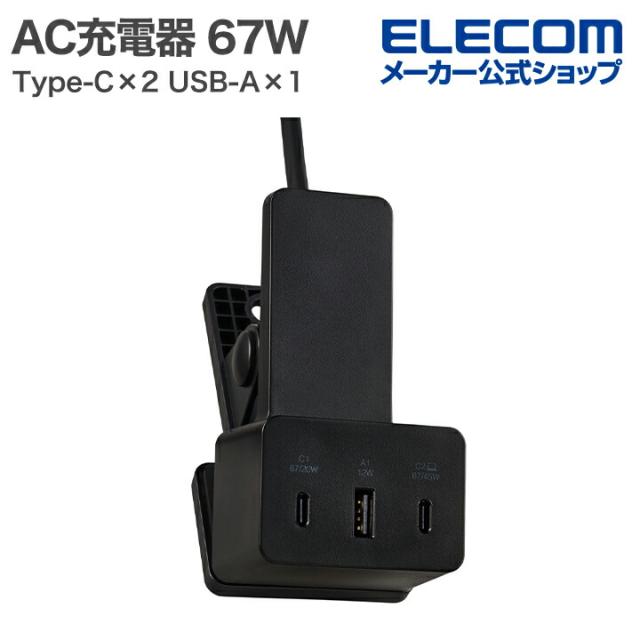 エレコム AC充電器 クリップ型 67W Type-C×2 USB-A×1 クリップ型 USB Power Delivery 67W USB-C×2 USB-A×1 ACケーブル一体 1.5m ブラック┃EC-AC11667BK