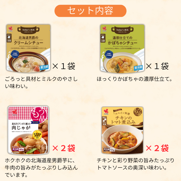 ●濃厚仕立てのかぼちゃシチュー:かぼちゃ(メキシコ産又は国産又はその他)、牛乳、鶏肉、たまねぎ、チキンブイヨン、ルウ(小麦粉、発酵バター)、クリーム、食塩、チーズ、植物油、清酒、砂糖、こしょう