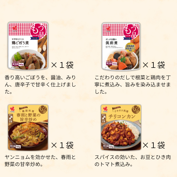 ●甘辛仕立ての鶏ごぼう煮:ごぼう(中国産)、鶏肉、しょうゆ(小麦・大豆を含む)、砂糖、本みりん、清酒、植物油、粉末調味料〔でん粉、糖類(粉末水あめ)、発酵調味料〕、トウバンジャン、唐辛子