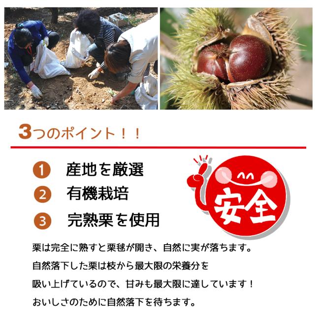 厳選された産地で、有機JAS認定、HACCP認証、ISO9001認証を取得し有機栽培された完熟栗を使用しています。