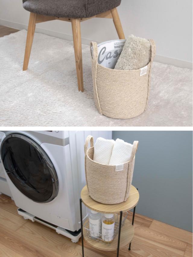 リビングのごちゃごちゃしがちな、ブランケットや雑誌などをまとめて収納しておくのに便利です。水まわりでも使える素材なので、ランドリーバスケットとしてもおすすめです。