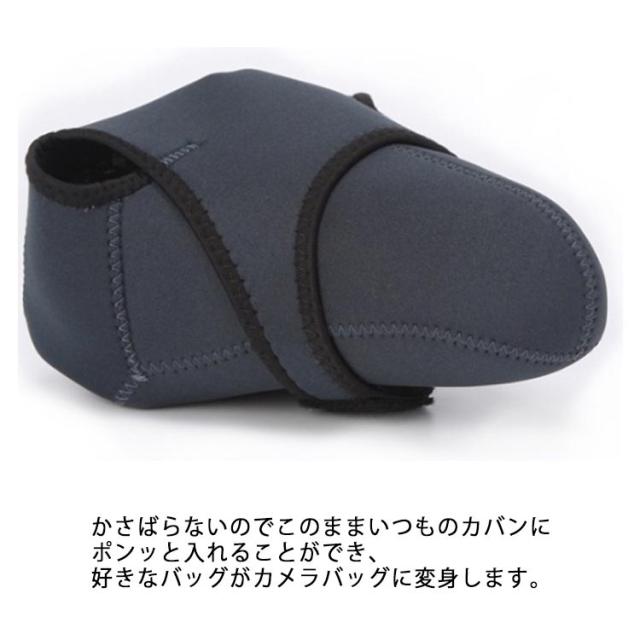 | 一眼レフ用 カメラポーチ S〜Lサイズ カメラを衝撃などから守ってくれるポーチ。 マジックテープで開閉楽々。シャッターチャンスも逃しません。 かさばらないのでこのままいつものカバンにポンッと入れることができ、好きなバッグがカメラバッグに変身します。 ウエットスーツのようなしなやかな生地でコンパクトながらもカメラをしっかり保護! 撥水性のある生地なので万一の事態でも安心。※完全防水ではございません。 | |