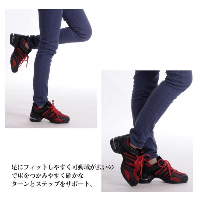 | 22.0〜26.0cm!ダンサーパフォーマンスを最大限引き出すダンススニーカー。 通気性・速乾性が高く快適な履き心地のテクノメッシュ素材。 靴底が前後二つに分かれたスプリットソール、土踏まずの底がないタイプ。 足にフィットしやすく可動域が広いので床をつかみやすく確かなターンとステップをサポート。 着地時の衝撃を緩和し、疲労を軽減するエアクッション。爪先立ちがしやすいスクエアトゥ。 ジャズシューズ、ダンススニーカー、社交ダンスシューズ兼用のジャズスニーカー。 | |