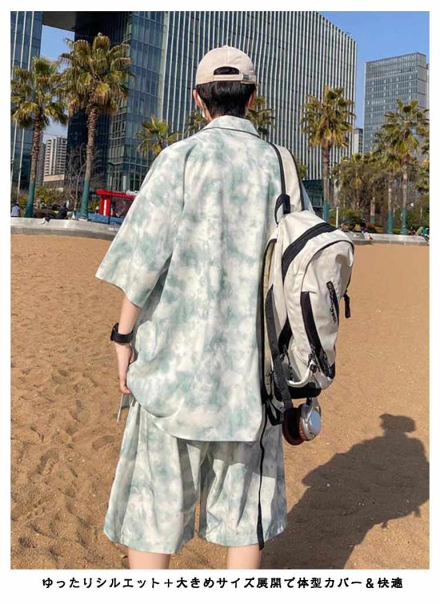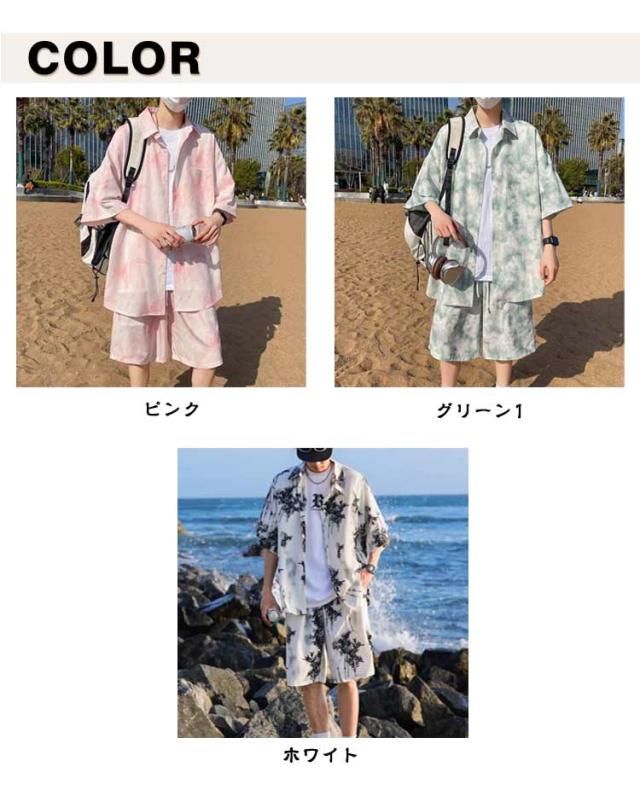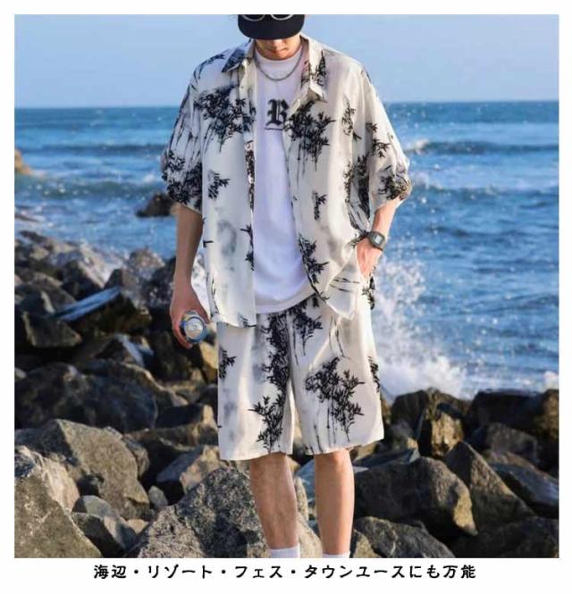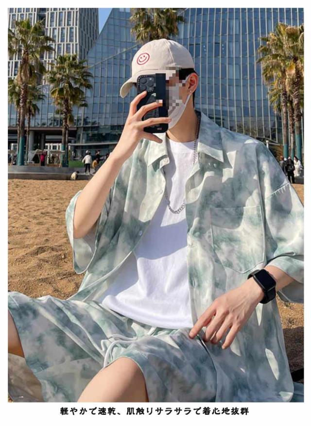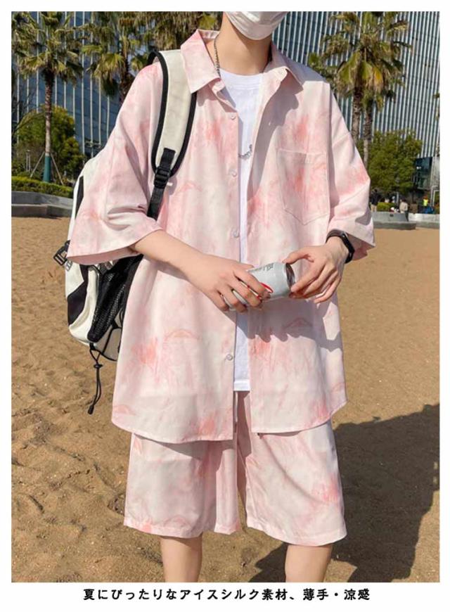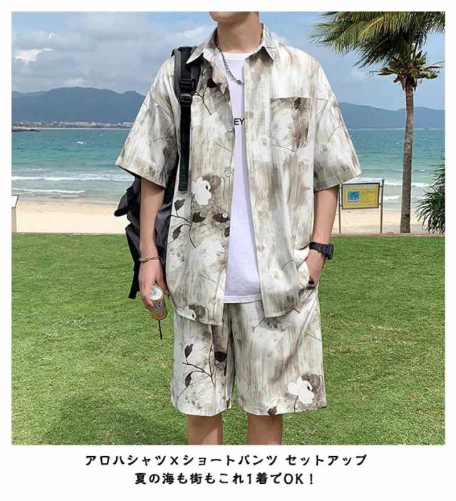春夏 セットアップ アロハ メンズ アイスシルク 半袖 アロハシャツ ショートパンツ 上下セット 開襟シャツ 涼感 薄手 アロハ ビーチシャツ トップス リゾート系 海 ビーチ プール