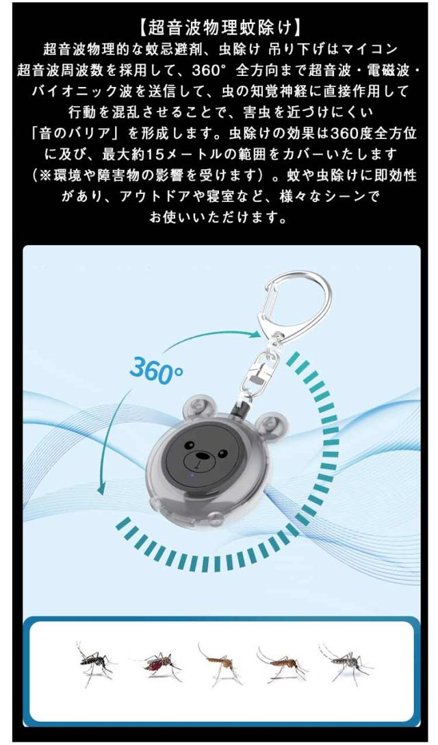 超音波 360° 妊婦 蚊除け 吊り下げ 送料無料 虫除け 蚊取り器 超音波虫除け 蚊忌避 子供 害虫駆除器 蚊取り器 蚊よけ対策 15m有効範囲 USB充電式 無臭無毒無放射 携帯便利 LEDライト付き 旅行 玄関 キャンプ 屋外