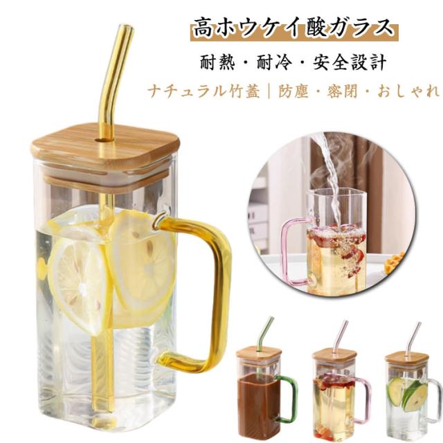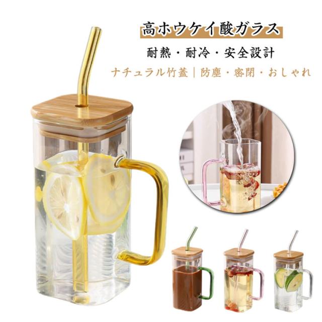 400ml ストロー付きグラス 耐熱グラス 【2個セット】ガラスコップ 竹蓋コップ 角型取っ手付き おしゃれ 角型ガラスカップ 【2個セット】ガラスコップ ドリンクグラス
