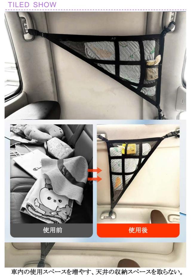 | 車内天井収納!ポリエステル材質採用耐久性があり丈夫。 メッシュ構造なので通気性も抜群。 車内の使用スペースを増やす、天井の収納スペースを取らない。 | |