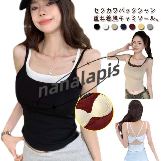 重ね着風 バックシャン キャミ キャミソール カップ付きキャミソール フェイクレイヤード タンク トップス バックオープンブラトップ カップ付きキャミソール 背中あき インナー 背中見せ 背中 開き ブラキャミソール バックリボン