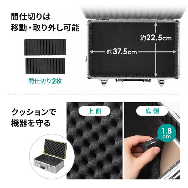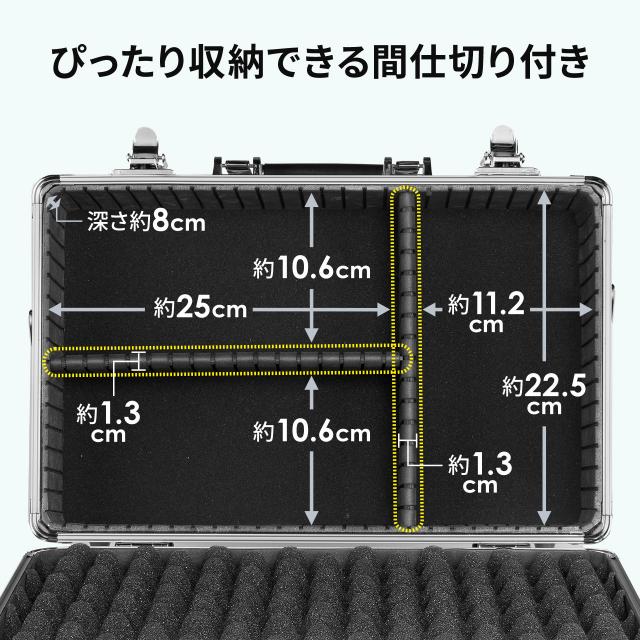 ●400-HSGS002のツアーガイド本体や、専用充電クレードル400-HSGS-CL2を収納できるアルミケースです。●内部の間仕切りは、移動や取り外しが可能でレイアウトを変更できます。