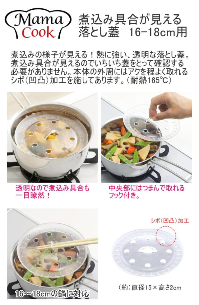 ママクック 煮込み具合が見える落とし蓋 16-18cm用 1枚 46807 日本製 燕三条 落とし蓋 落しぶた 鍋 1枚 クリア 透明 中が見える 透明フタ 煮込む 煮込み料理 あくとり あく取り アク 食洗器OK 便利 キッチン キッチン用品 調理器具 下村企販