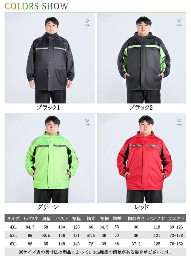 | 大きいサイズレインウェア上下セットです。 透明バイザー付きで視界良好。 前後とも安全反射テープ付き。 防水力高め、丈夫で破れにくいレインウェアです。 ズボンの腰部分はゴム入りですから、服の上からはいても動きやすく、通勤・通学・自転車・バイクなどの日常使いはもちろん、キャンプや釣り、ハイキングなどのアウトドアまで幅広くご使用いただけます。梅雨シーズンの豪雨・台風対策などでも活躍間違いなしです! | |