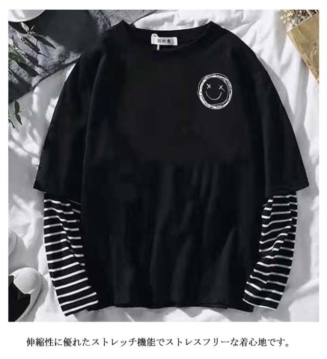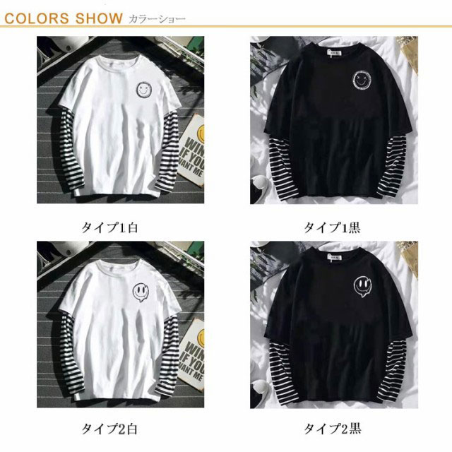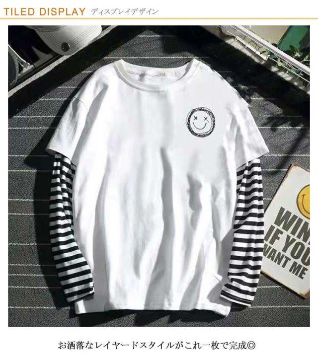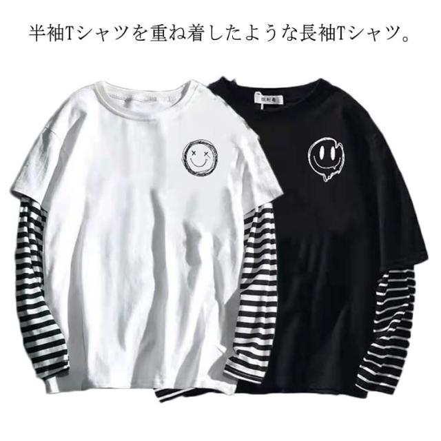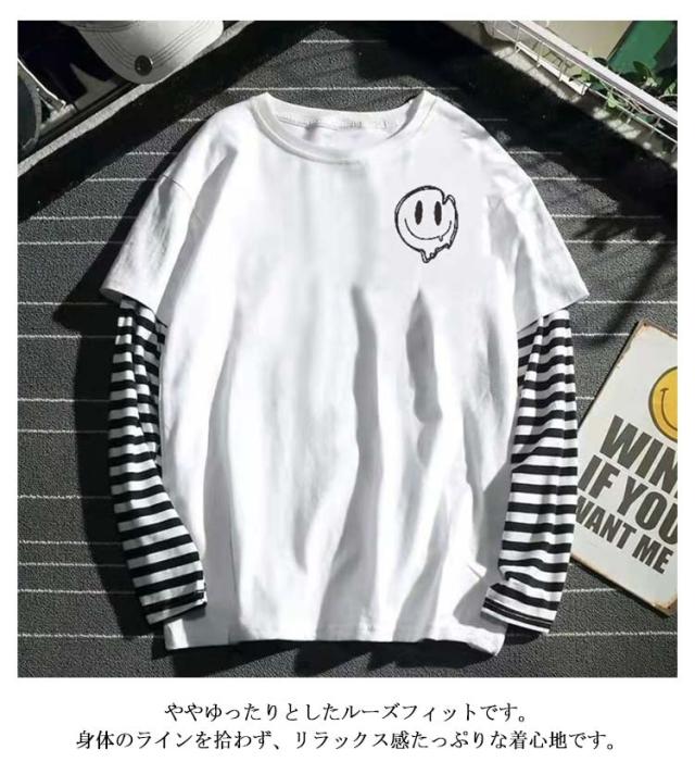 【送料無料】長袖 カットソー tシャツ メンズ Uネック 丸首 重ね着風 レイヤード風 ロンT トップス スマイル ボーダー柄 無地 シンプル ワンポイント ゆったり 薄手 Tシャツ 大きいサイズ S M L XL 2XL LL
