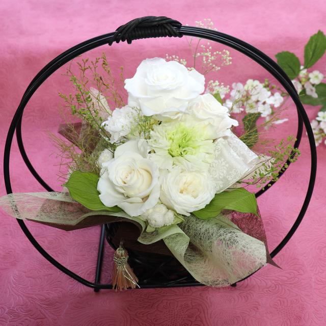 薔薇やカーネーションとたくさんのプリザーブドフラワーを使用しています。和室にも洋室にもぴったりなアレンジです。