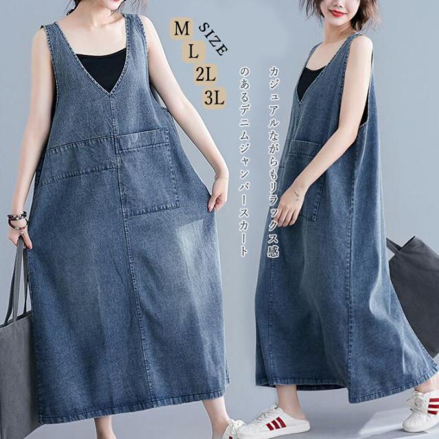 サロペットスカート ジャンパースカート オーバーオール オールインワン デニムワンピース ロング丈 デニム ノースリーブ 体型カバー マキシ丈 レディースワンピース 大きめ 春 夏 ワンピース M L 2L 3L