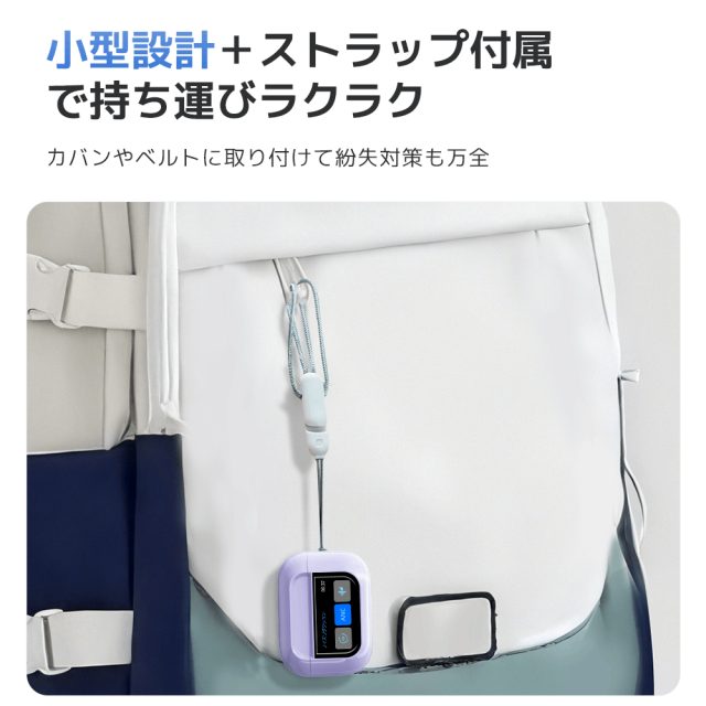 ストラップ付きの小型ケースで、カバンやベルトに簡単に装着でき、紛失防止にも役立ちます。持ち運びがラクラク。