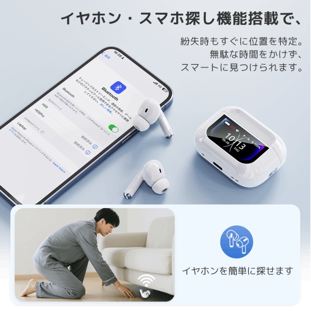 紛失時に音や画面で場所を特定できる探索機能付き。スマホ・イヤホン双方の位置をすぐに見つけられ、時間の無駄なく探し物のストレスを軽減します。