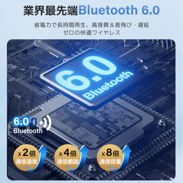 最新のBluetooth 6.0により、通信速度は従来の2倍、通信範囲は4倍、通信容量は8倍に向上。接続の安定性が高く、動画視聴やゲーム、会議中でも遅延や音飛びを抑制します。