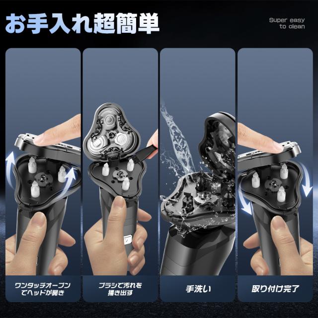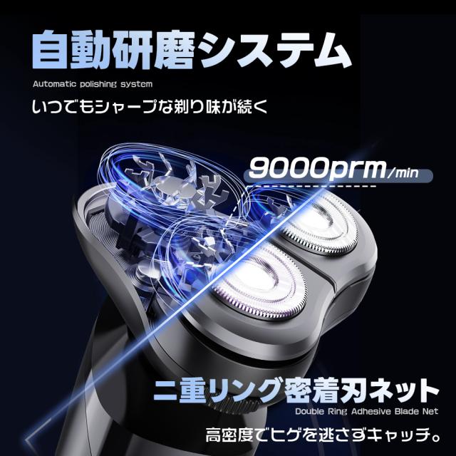 【高速回転9000rpm・自動研磨システム】 最新の高速回転モーターと極薄メッシュ刃3ヘッドを搭載した 電動シェーバーは、耐久性があり、9000rpm/分の高速回転で、1分間で早剃り&深剃りを同時に実現します。