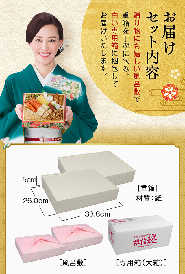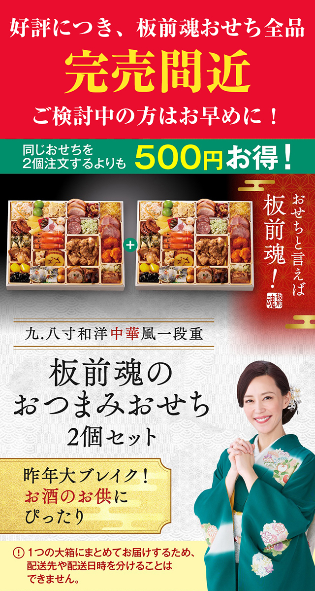 板前魂のおせち料理は、函館、小樽 、仙台、 築地 、山梨、金沢、浜松、 京都 、下関、 博多 、鹿児島など日本や海外の産地をまわり厳選した食材を使用し、有名店やホテルで修行したシェフや繁盛店を営む板長といった4人の匠が監修しています。