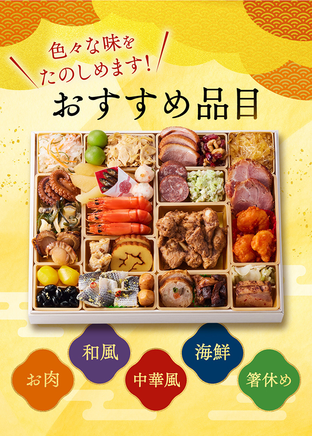 少人数から大人数まで、大人も子どもも皆様で味わい楽しめる、家族や口コミで人気のおせちを一段重〜七段重まで60種類以上取り揃えました。ご予約受付中。