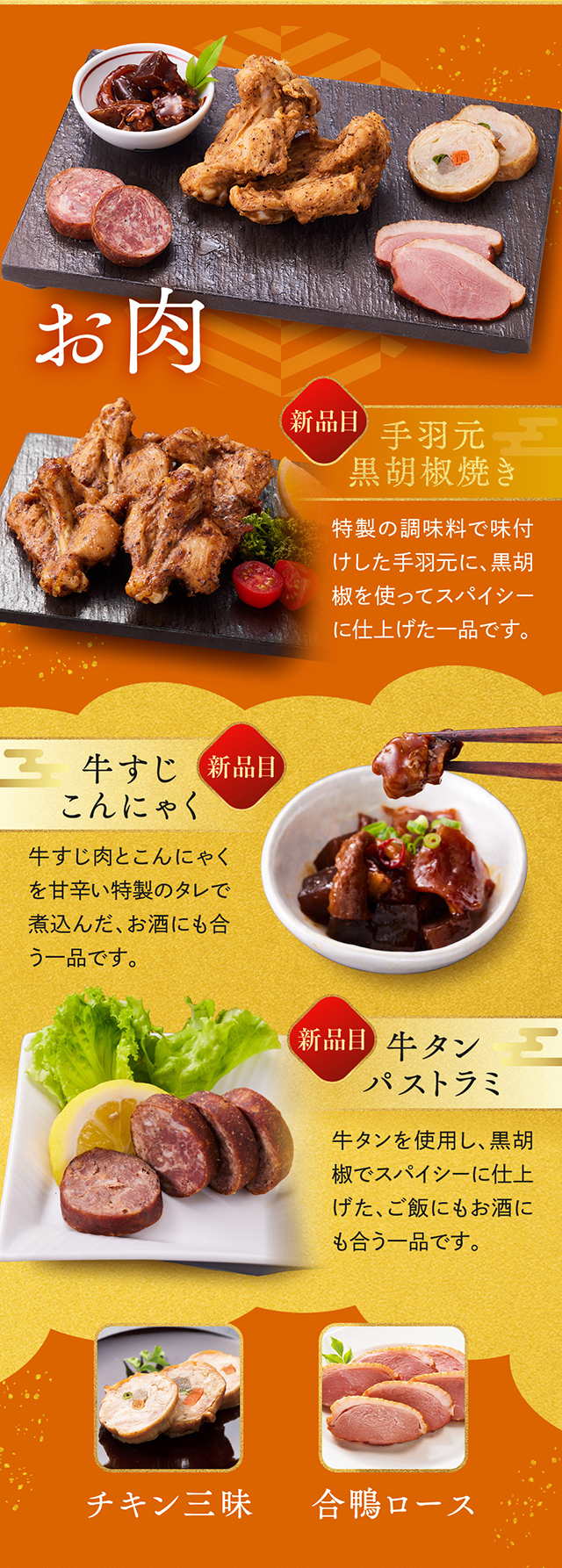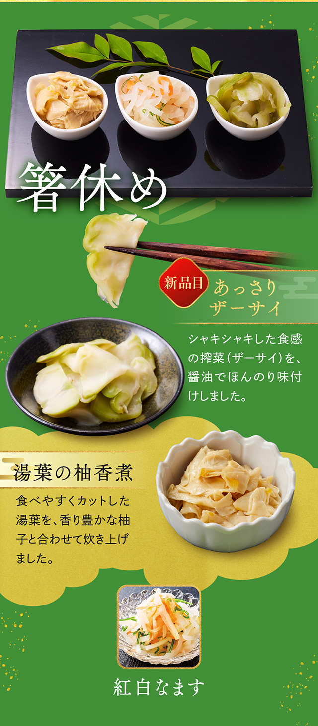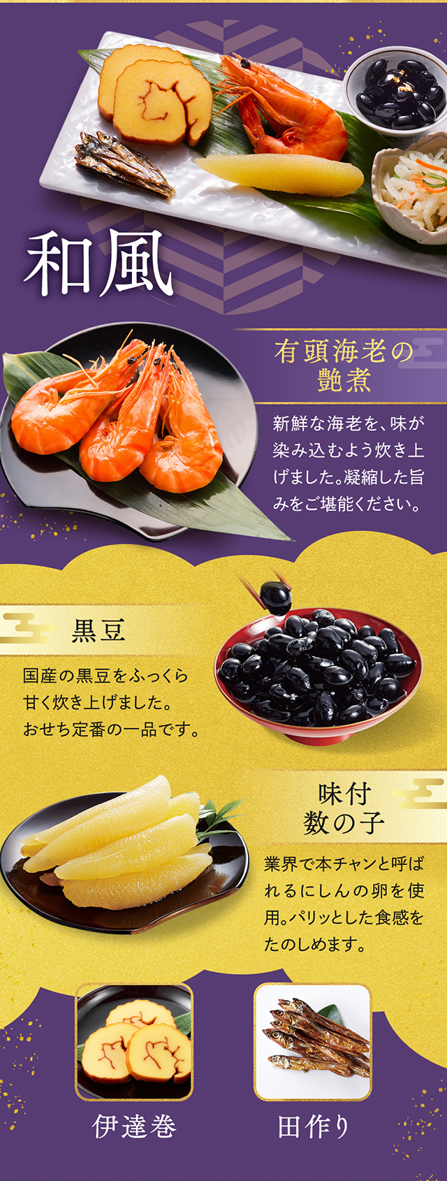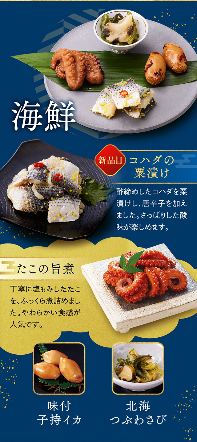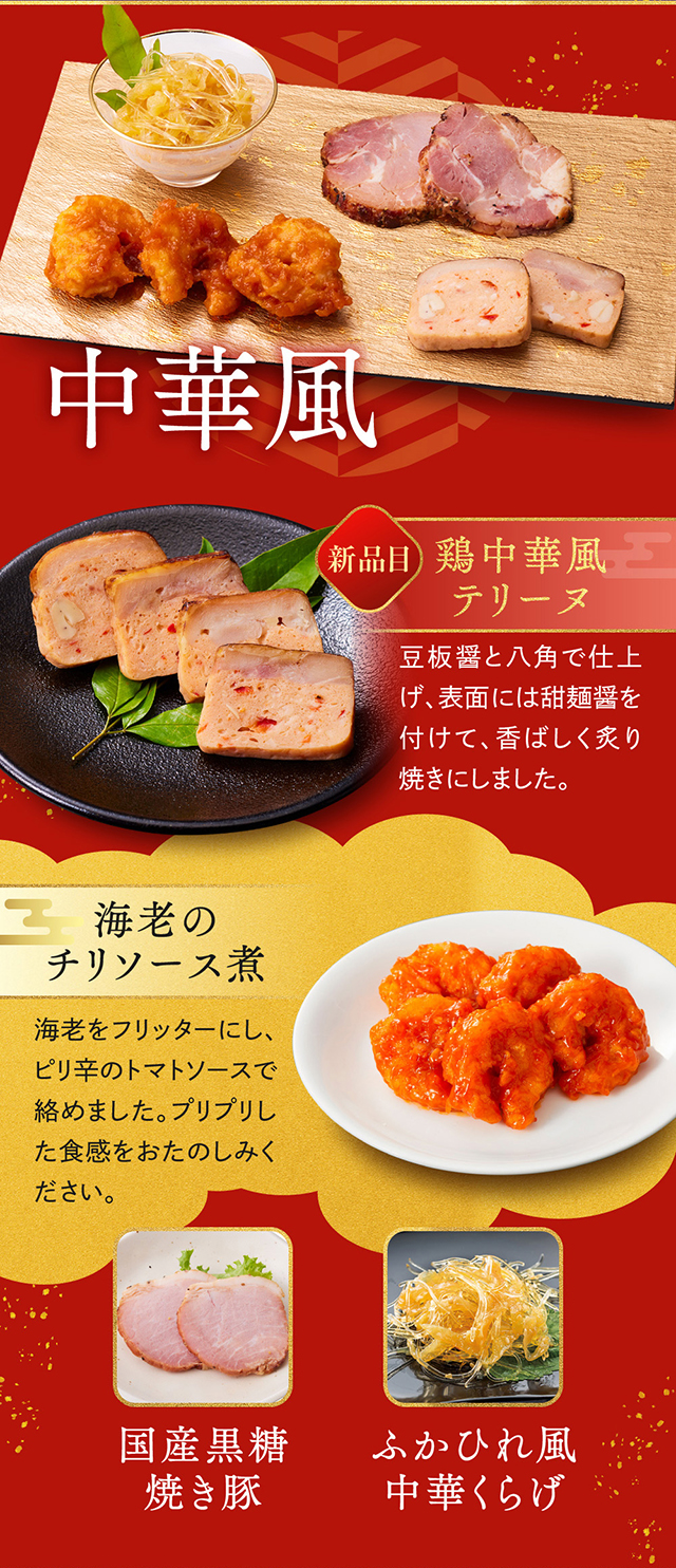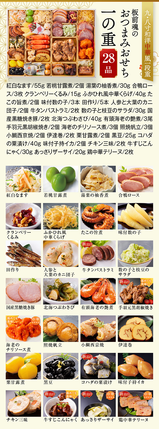 【一の重】紅白なます/若桃甘露煮/湯葉の柚香煮/合鴨ロース/クランベリーくるみ/ふかひれ風中華くらげ/たこの旨煮/味付数の子/田作り/人参と大葉のカニ団子/牛タンパストラミ/数の子と枝豆のサラダ/国産黒糖焼き豚/北海つぶわさび/有頭海老の艶煮/手羽元黒胡椒焼き/海老のチリソース煮/照焼帆立/小鯛西京焼/伊達巻/栗甘露煮/黒豆/コハダの粟漬け/味付子持イカ/チキン三昧/牛すじこんにゃく/あっさりザーサイ/鶏中華テリーヌ