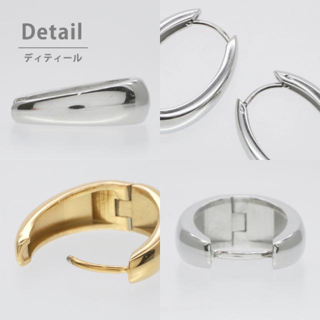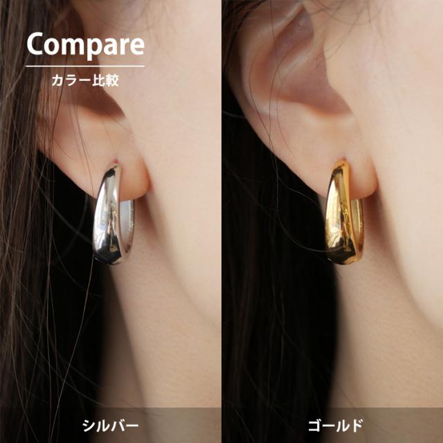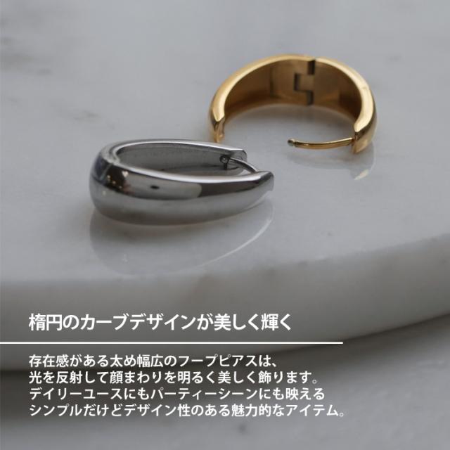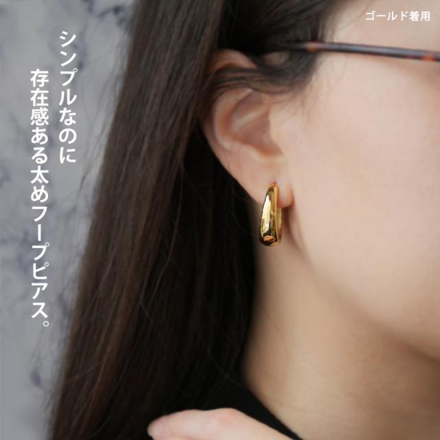 存在感がある太め幅広のフープピアスは、光を反射して顔周りを明るく美しく飾ります。