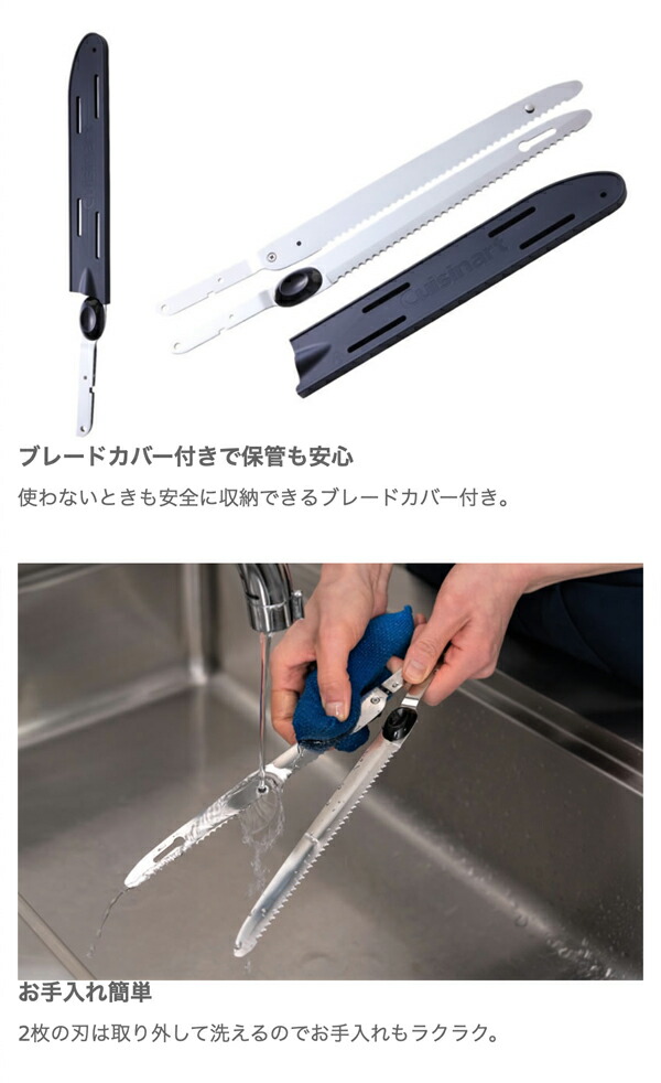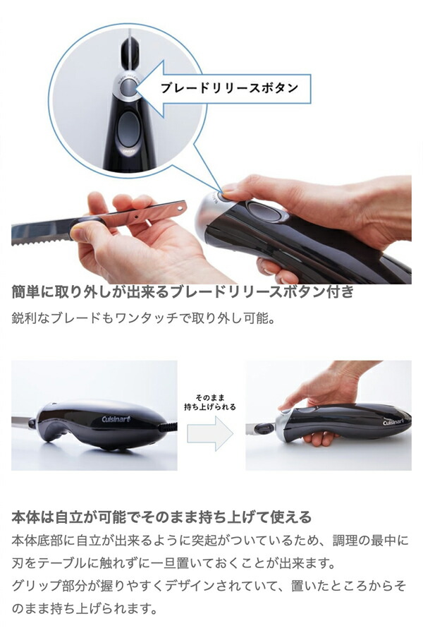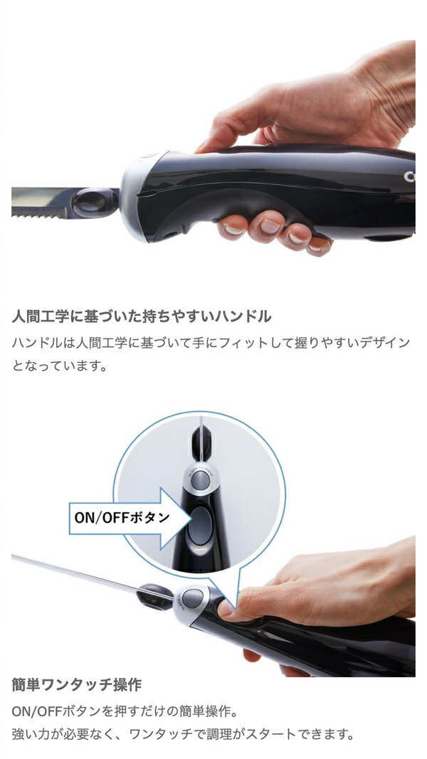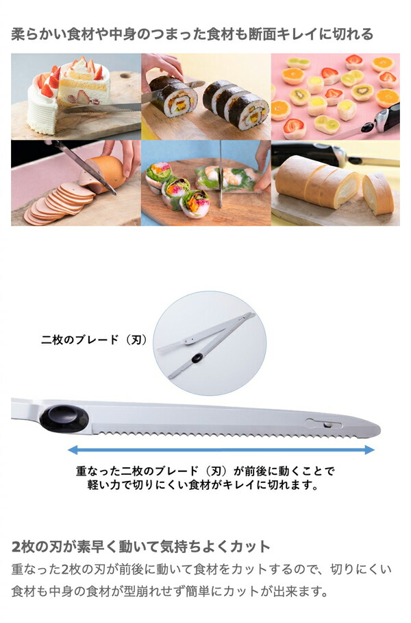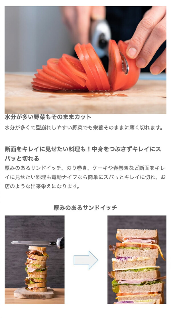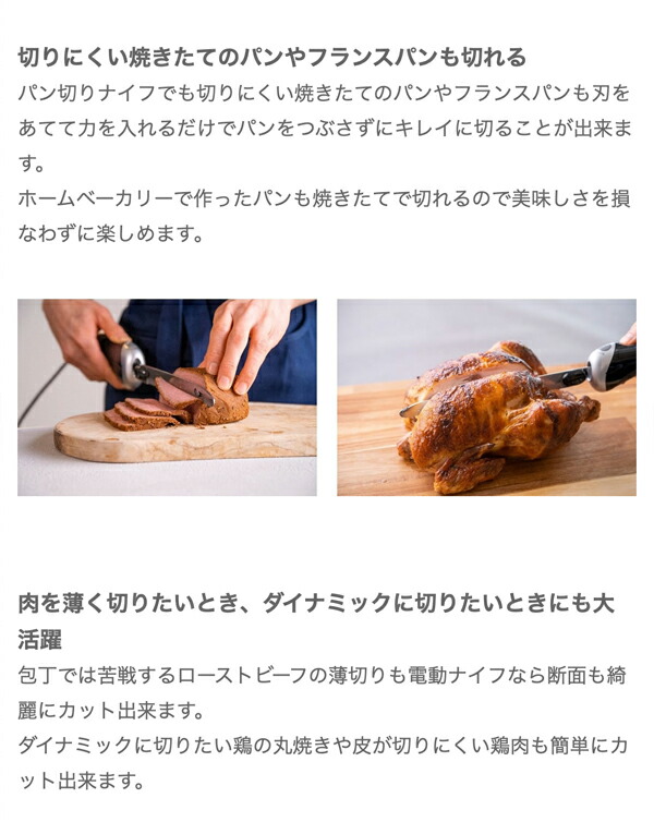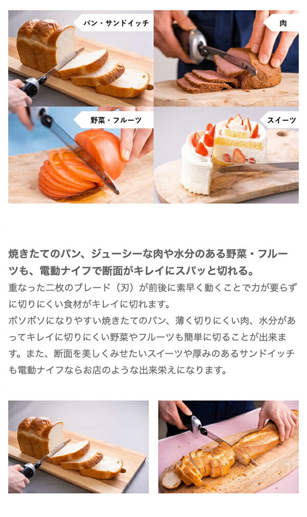 切れ味抜群! 切りにくい食材もキレイにスパッと切れる! 焼きたてのパン、ジューシーな肉や水分のある野菜・フルーツも、電動ナイフで断面がキレイにスパッと切れる。 重なった二枚のブレード(刃)が前後に素早く動くことで力が要らずに切りにくい食材がキレイに切れます。 ボソボソになりやすい焼きたてのパン、薄く切りにくい肉、水分があってキレイに切りにくい野菜やフルーツも簡単に切ることが出来ます。また、断面を美しくみせたいスイーツや厚みのあるサンドイッチも電動ナイフならお店のような出来栄えになります。 切りにくい焼きたてのパンやフランスパンも切れる パン切りナイフでも切りにくい焼きたてのパンやフランスパンも刃をあてて力を入れるだけでパンをつぶさずにキレイに切ることが出来ます。 ホームベーカリーで作ったパンも焼きたてで切れるので美味しさを損なわずに楽しめます。 肉を薄く切りたいとき、ダイナミックに切りたいときにも大活躍 包丁では苦戦するローストビーフの薄切りも電動ナイフなら断面も綺麗にカット出来ます。 ダイナミックに切りたい鶏の丸焼きや皮が切りにくい鶏肉も簡単にカット出来ます。 水分が多い野菜もそのままカット 水分が多くて型崩れしやすい野菜でも栄養そのままに薄く切れます。 断面をキレイに見せたい料理も!中身をつぶさずキレイにスパッと切れる 厚みのあるサンドイッチ、のり巻き、ケーキや春巻きなど断面をキレイに見せたい料理も電動ナイフなら簡単にスパっとキレイに切れ、お店のような出来栄えになります。 2枚の刃が素早く動いて気持ちよくカット 重なった2枚の刃が前後に動いて食材をカットするので、切りにくい食材も中身の食材が型崩れせず簡単にカットが出来ます。 人間工学に基づいた持ちやすいハンドル ハンドルは人間工学に基づいて手にフィットして握りやすいデザインとなっています。 簡単ワンタッチ操作 ON/OFFボタンを押すだけの簡単操作。 強い力が必要なく、ワンタッチで調理がスタートできます。 簡単に取り外しが出来るブレードリリースボタン付き 鋭利なブレードもワンタッチで取り外し可能。 本体は自立が可能でそのまま持ち上げて使える 本体底部に自立が出来るように突起がついているため、調理の最中に刃をテーブルに触れずに一旦置いておくことが出来ます。 グリップ部分が握りやすくデザインされていて、置いたところからそのまま持ち上げられます。 ブレードカバー付きで保管も安心 使わないときも安全に収納できるブレードカバー付き。 お手入れ簡単 2枚の刃は取り外して洗えるのでお手入れもラクラク。