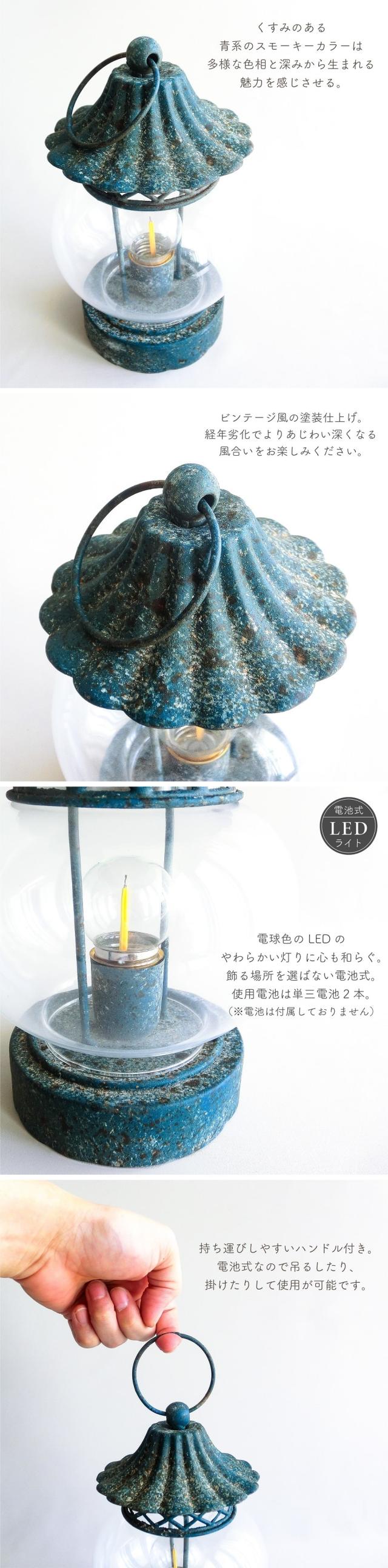 クラシックな雰囲気の味わい深いアンティーク感、武骨な素材感がもつ魅力的なヴィンテージ加工済の「LEDランタン」。インダストリアルなインテリアやアンティークな印象を与えたい空間の演出にぴったり。くすみのある青系のスモーキーカラーは多様な色相と深みから生まれる魅力を感じさせる。