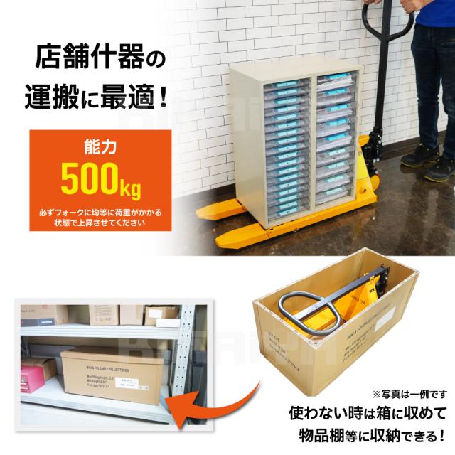 ミニハンドリフト 500kg 折りたたみ式 軽量 コンパクト 店舗什器運搬 台車 フォーク長さ795mm フォーク全幅380mm 高さ60mm ハンドパレット KIKAIYA