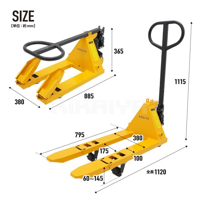 | サイズ | ・全長 1120mm ・フォーク長さ 795mm ・フォーク全幅 380mm ・フォーク爪幅 100mm ・フォーク間 175mm ・フォーク最高/最低高さ 145/60mm ・折りたたみサイズ (L)885×(W)380×(H)365mm |