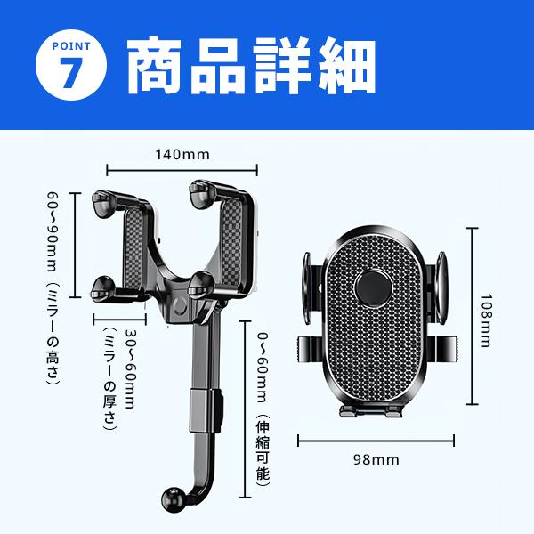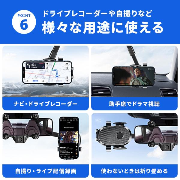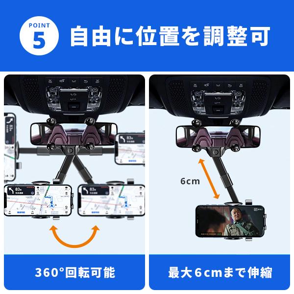 このスマホホルダーは、4.5?7.0インチのスマホに対応し、iPhoneやGalaxyなど幅広い機種で使用可能。ルームミラーに簡単に取り付けられ、視線の高さにスマホをセットできるため、ナビアプリの確認も快適です。従来モデルから進化し、360°回転に加え、前後移動やアームの伸縮機能が向上。より自由な角度調整が可能になりました。