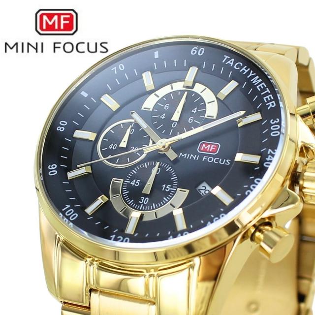 正規品 MINI FOCUS メンズ腕時計 クロノグラフ クォーツ 日付表示 ステンレスバンド かっこいい 腕時計 手表 メンズ 父の日 ゴールド ブラック 高級感 おしゃれ ビジネス カジュアル 誕生日 プレゼント 男性 旦那 彼氏 ギフト 就職祝い 成人 卒業 入学