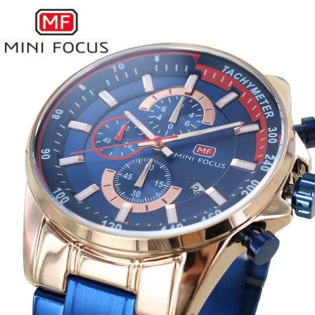 正規品 MINI FOCUS メンズ腕時計 クロノグラフ クォーツ 日付表示 ステンレスバンド かっこいい 腕時計 手表 メンズ ブルー ローズゴールド 高級感 おしゃれ ビジネス カジュアル 誕生日 プレゼント 男性 旦那 彼氏 ギフト 父の日 就職祝い