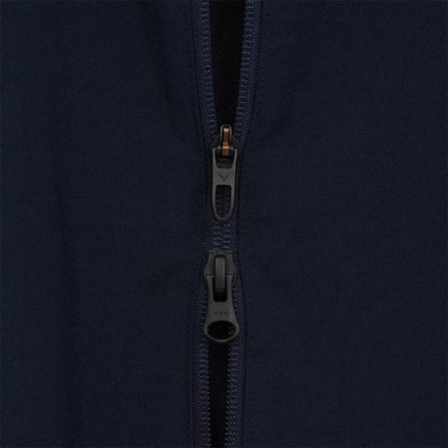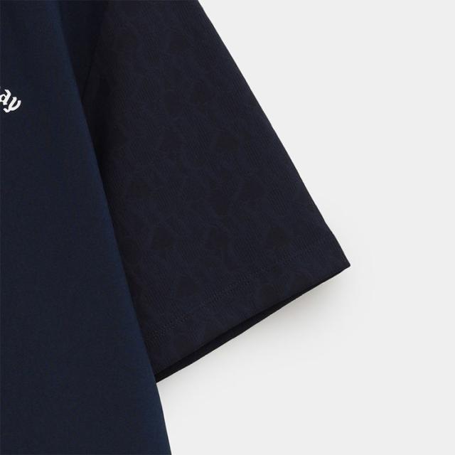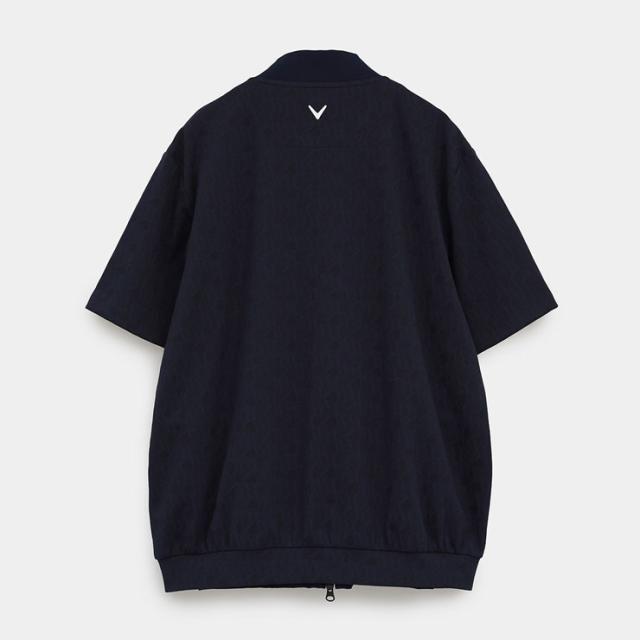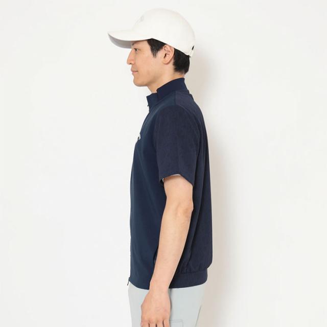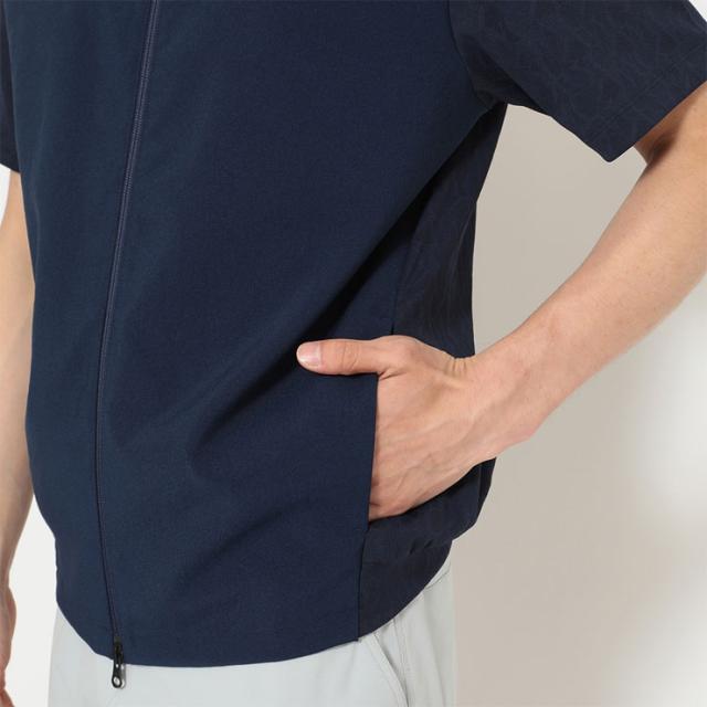 前身にはアウター素材、運動量が必要な後身と袖にはジャカードカットソー素材を組み合わせたハイブリッド仕様の半袖ブルゾンです。フルジップでさっと羽織れて、すぐに脱げる手軽さも嬉しいポイントです。ジャカードカットソーはストレッチ性に優れているため動きやすく、立体感のある編み組織が付加価値の高いデザイン仕様になっています。