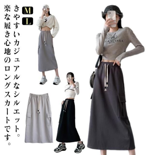 着やせ カーゴスカート カーゴスカート レディース ウエストゴム カーゴ ロングスカート スカート スポーティー ポケット付き ボトムス スウェットスカート ロング 楽ちん おしゃれ 部屋着 無地 体型カバー カジュアル