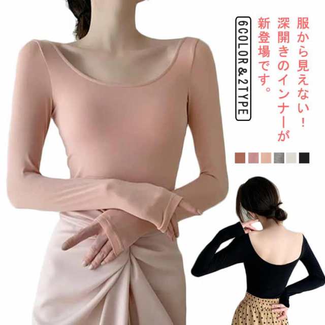 服から見えない シンプル インナー インナー あったか 背中あき 深開き 襟ぐり広め バレエネック 無地 バックオープン 薄手 肌着 長袖 防寒 トップス チラ見え防止 お洒落